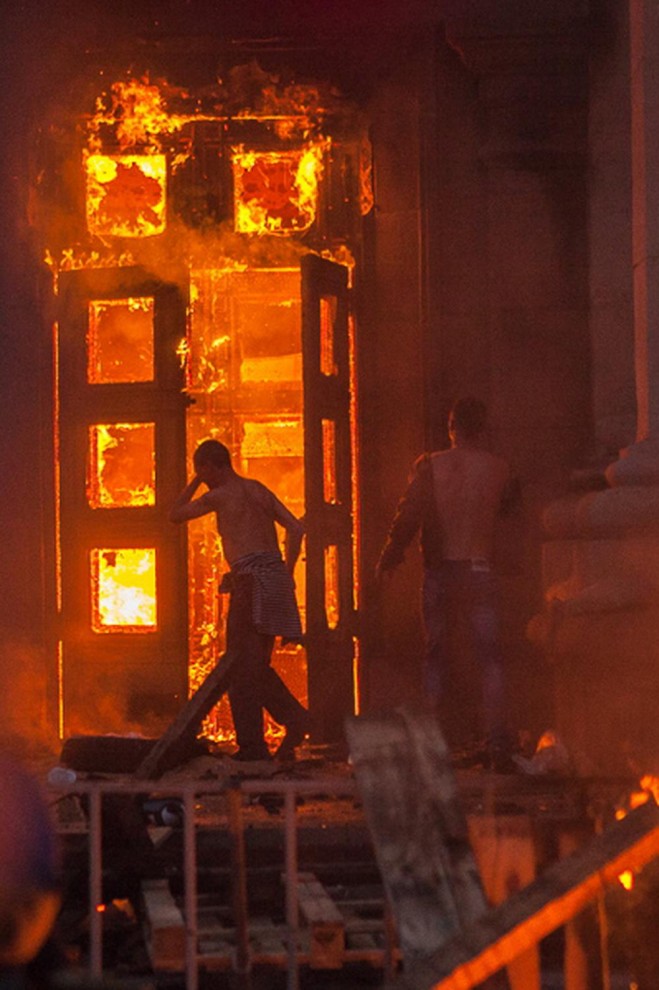 Les miliciens néonazis incendient alors le bâtiment, où des centaines de personnes se trouvent prisent au piège. Parmi eux des femmes et des enfants. Ceux qui tentent de sortir sont attaqués à coup de haches et de battes de base-ball. Certains, pour échapper aux flammes, se jettent par les fenêtres de la Maison des Syndicats.